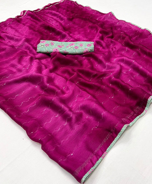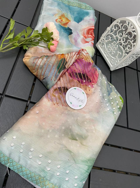 Chiffon sarees - foil mirror work designer saree - turquoise party wear saree - saree for women - saree for Christmas