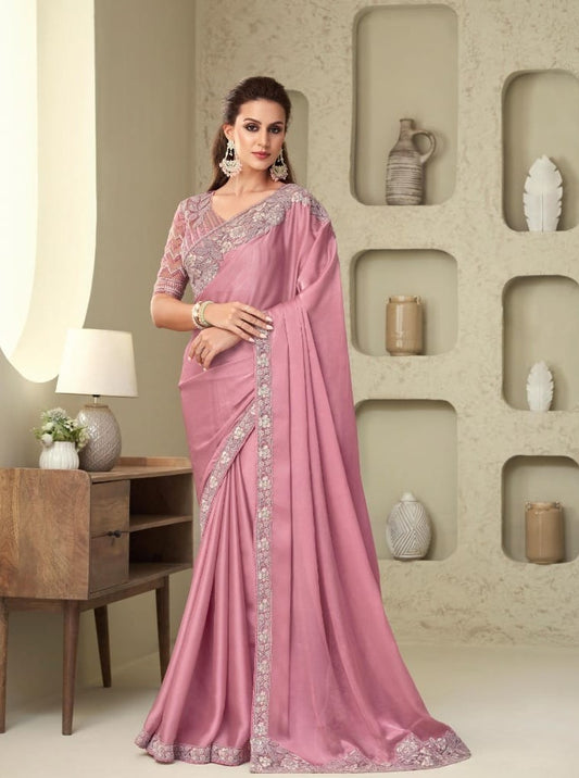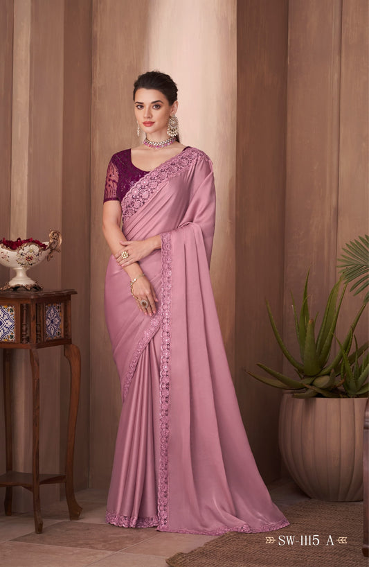 Elegant Mauve Satin Saree with Embroidered Border