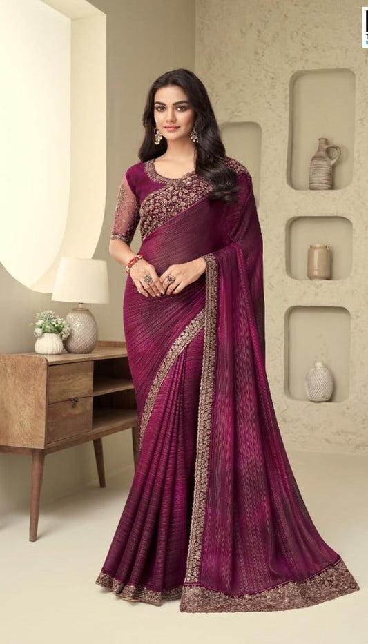 Blue and Red Mauve Satin Saree with Embroidered Border