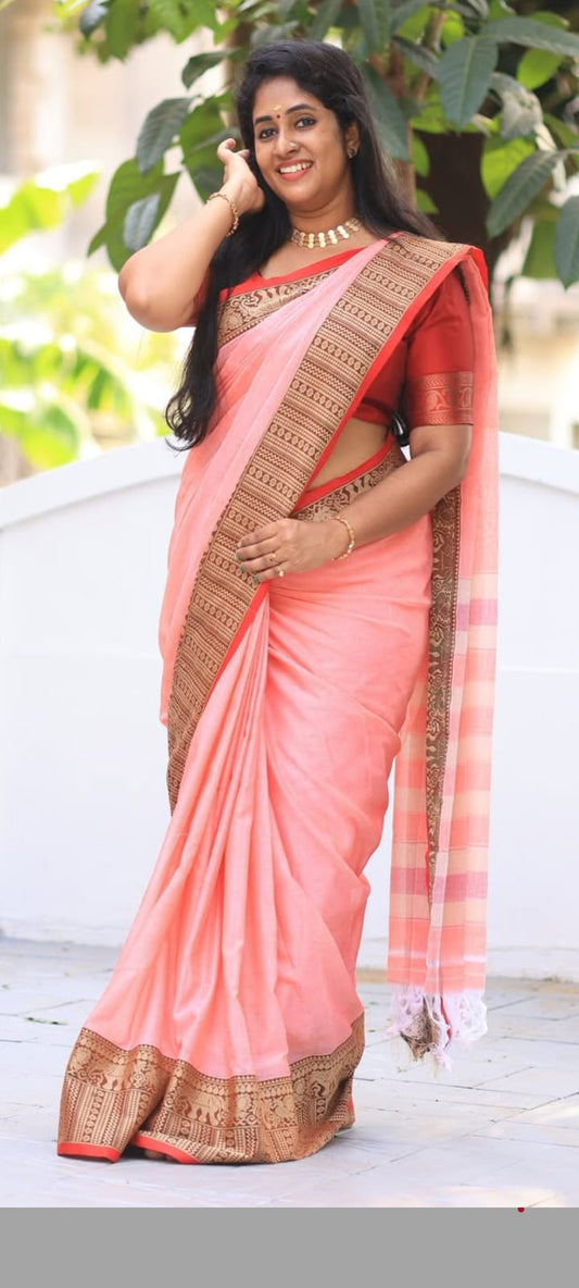 Peach orange narayanpeth Mezadaise Cotton Saree with Intricate Border