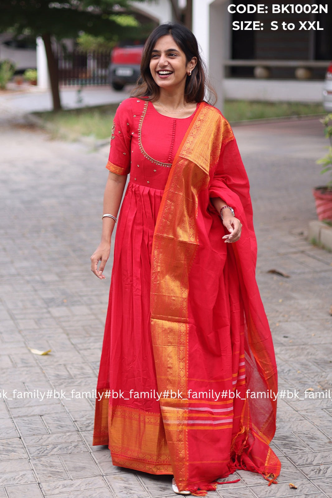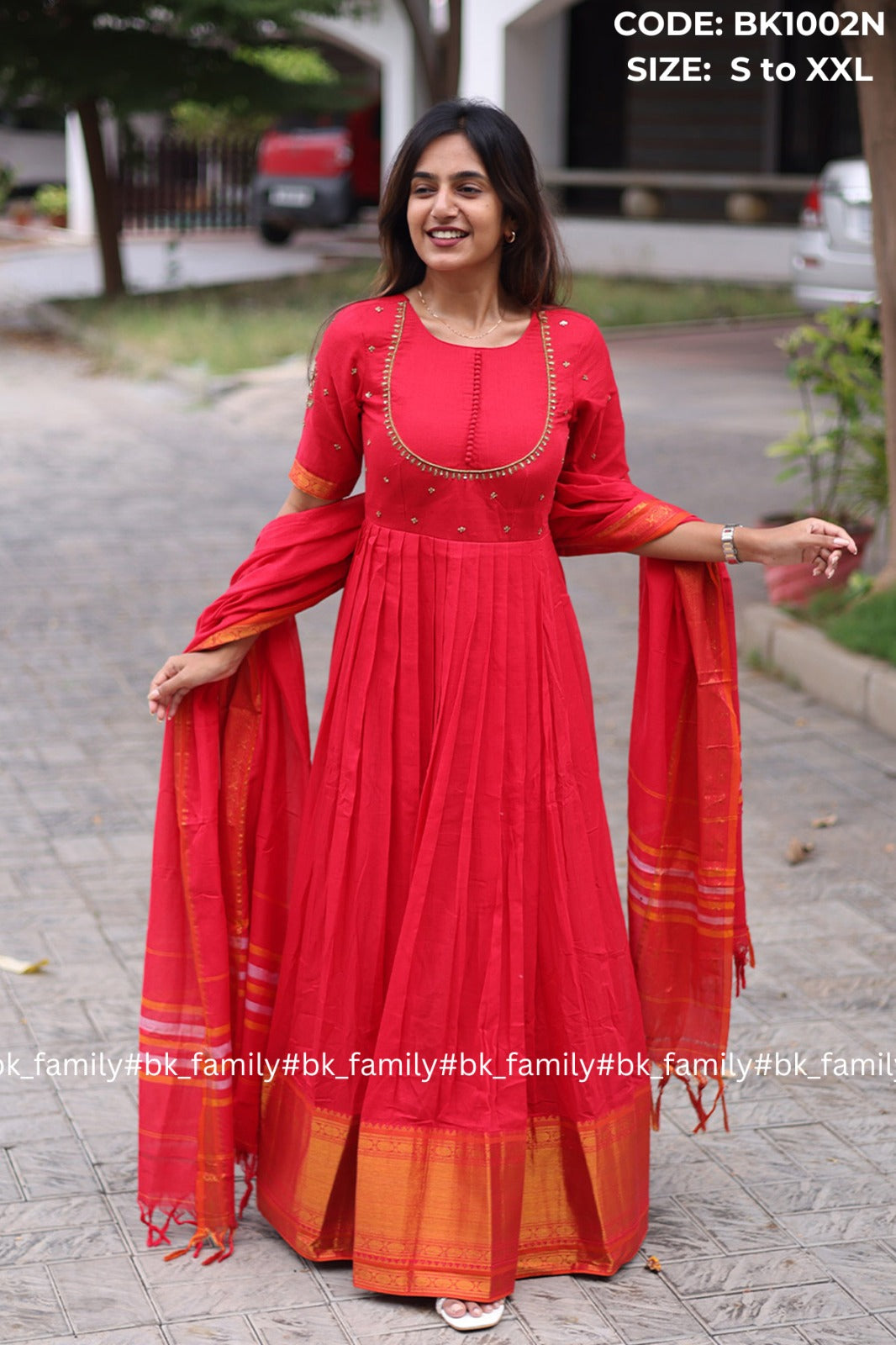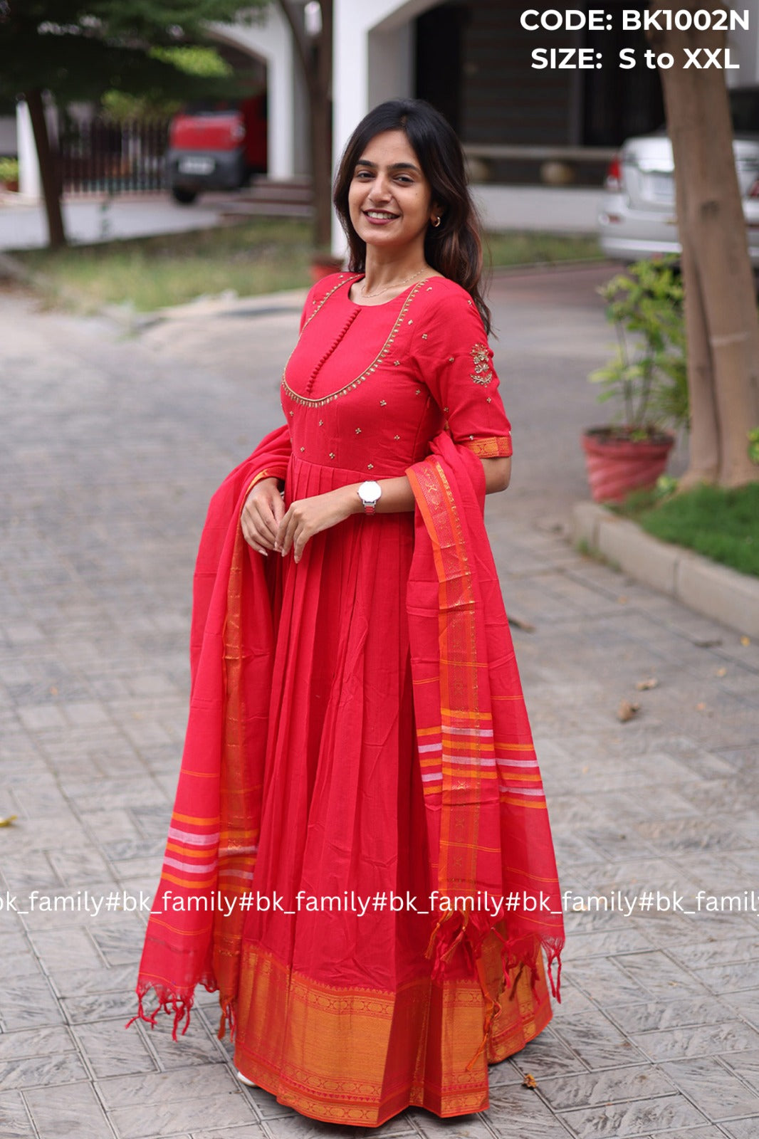 Experience the exquisite artistry of the Sutrangi Anarkali Dress in vibrant red, blending traditional elegance with contemporary style. This floor-length gown features a modest round neckline and intricate hand embroidery on the yoke and sleeves, adding refined charm. The golden thread woven border and carefully gathered knife pleats ensure both grace and comfort. Complemented by a matching handloom dupatta, this ensemble is ideal for special occasions. Pair it with understated traditional jewelry and simple flats for a polished, sophisticated look.