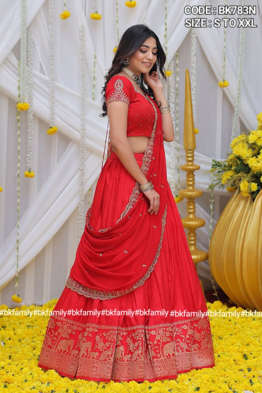 Crafted for festive occasions, this elegant Maharani Half Saree Set in Red features vibrant hand embroidery with delicate golden thread and a georgette dupatta with lace detailing. The padded blouse, with its sweetheart neckline, completes the look.