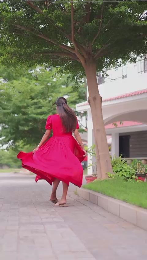 Introducing a vibrant red, ankle-length midi dress. This radiant ruby is crafted with soft zara chiffon fabric with a small fabric button (potli), these fabric-covered buttons down the front. The short puffed sleeves of the outfit add a delicate touch, and the fabric is embellished with small minimal floral handwork. The flare of the dress creates a graceful silhouette. For a graceful look match with accessories like a watch, bracelet, and even from heels to flat will make a perfect look. You can go with a casual hairstyle, to make it an overall casual look, comfortable, and ideal for get-togethers or semi-formal occasions.