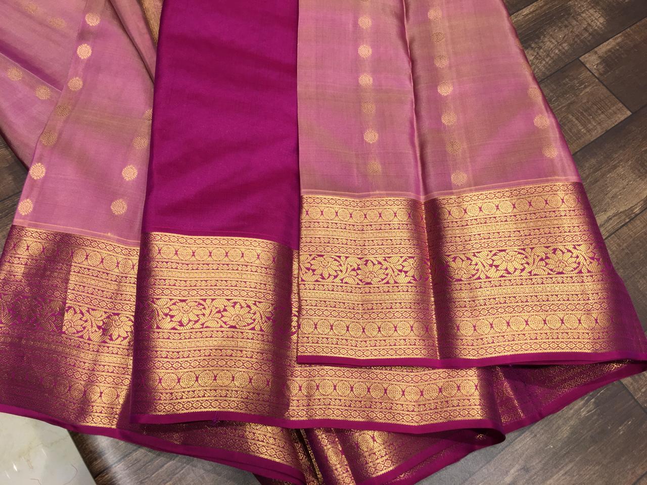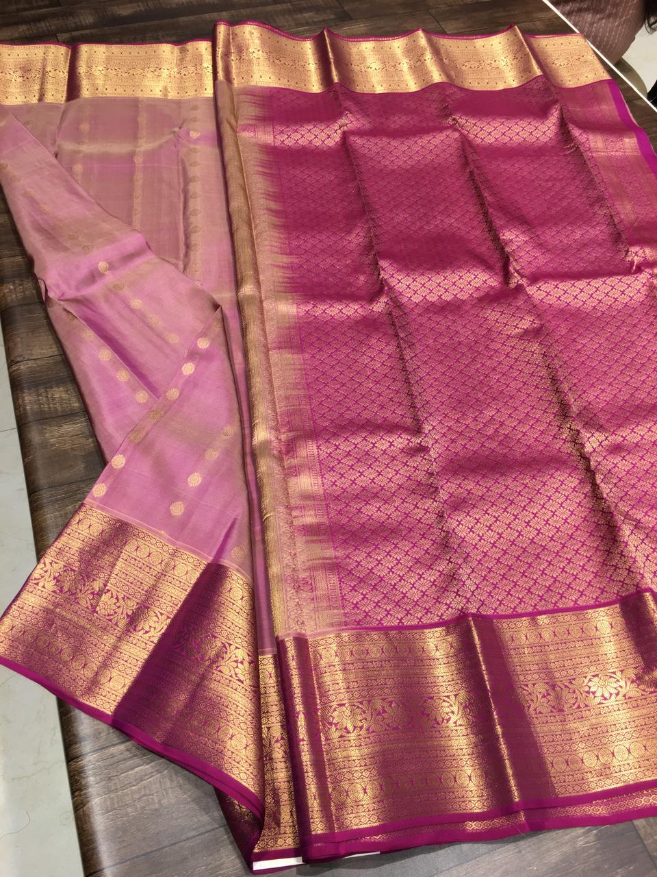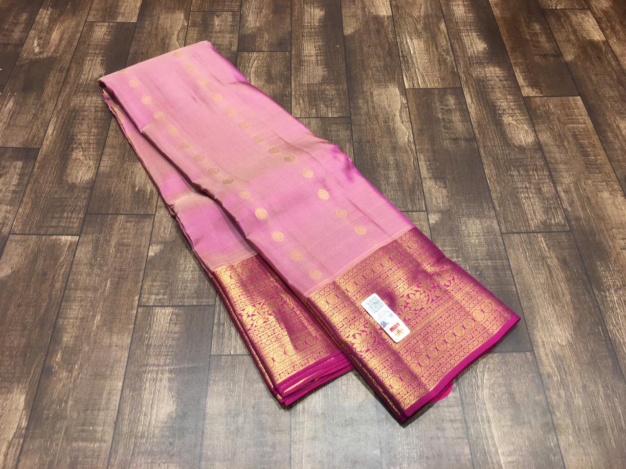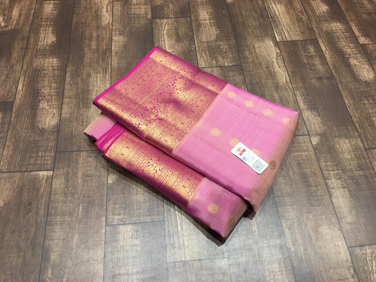 Step into elegance with this stunning Kanchipuram Pure Silk Saree, a timeless masterpiece perfect for weddings, festivals, and grand occasions. Crafted from premium quality pure silk and adorned with intricate gold zari work, this saree features a graceful light pink body with traditional motifs and a richly woven contrast pink and gold pallu and border.