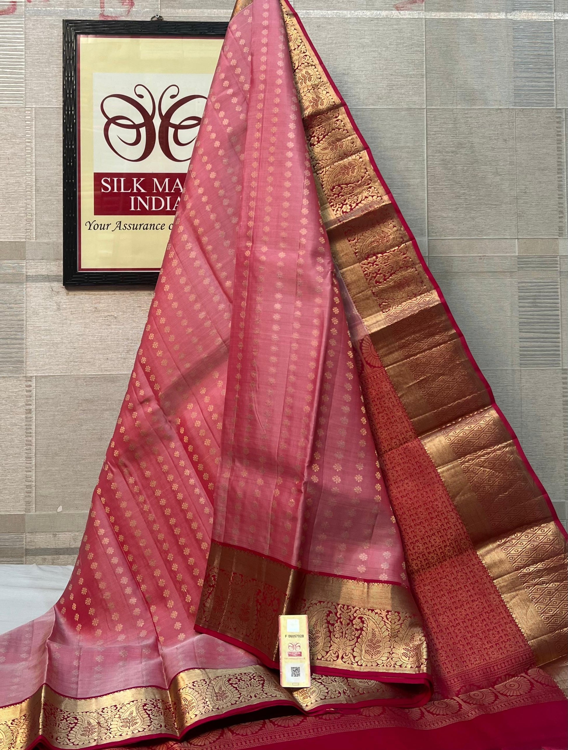 Celebrate tradition with this exquisite Kanchivaram saree, featuring a striking pink body and vibrant red border embellished with detailed zari craftsmanship. Made from 100% authentic Kanchipuram silk, certified by the Silk Mark, this genuine Pattu saree supports the rich heritage of the Indian handloom industry.