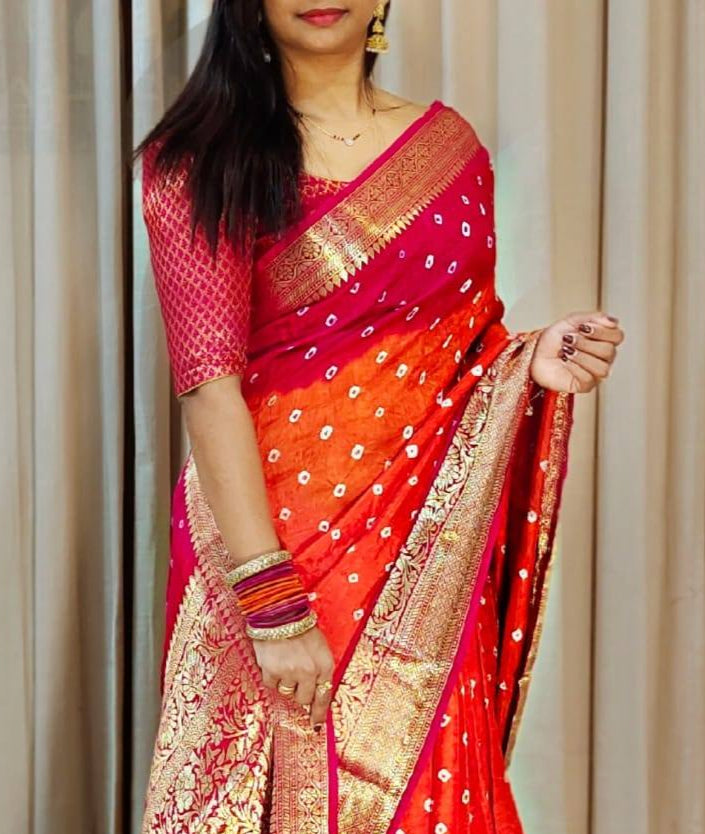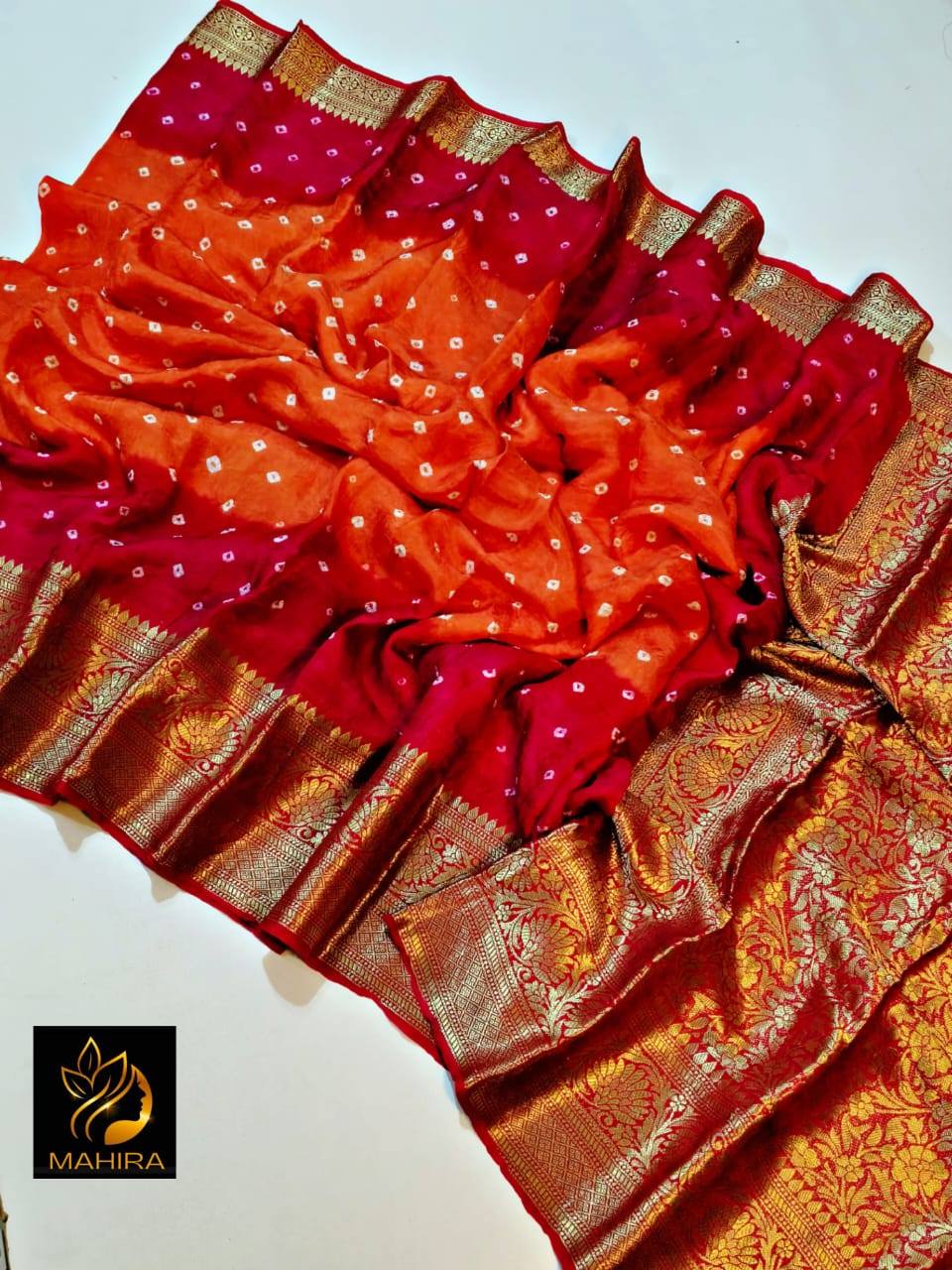 Pure Bandhej Silk Saree combines authentic Bandhej artistry with fine pure silk. The hand-tied pattern reveals vibrant tones, finished with detailed Kanchipuram zari border and a lustrous pallu. Each weave reflects heritage craftsmanship valued across South India.