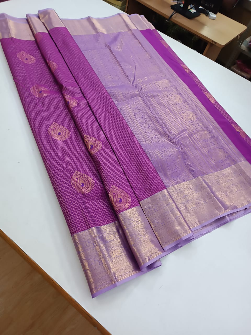 This exquisite Purple Semi Kanchipuram Saree represents the pinnacle of South Indian textile artistry, designed for discerning brides. Rich golden zari work adorns the entire body, complemented by a commanding woven border that showcases meticulous craftsmanship. The ornate zari pallu and delicate scattered motifs embody the sophisticated elegance characteristic of traditional wedding wear.