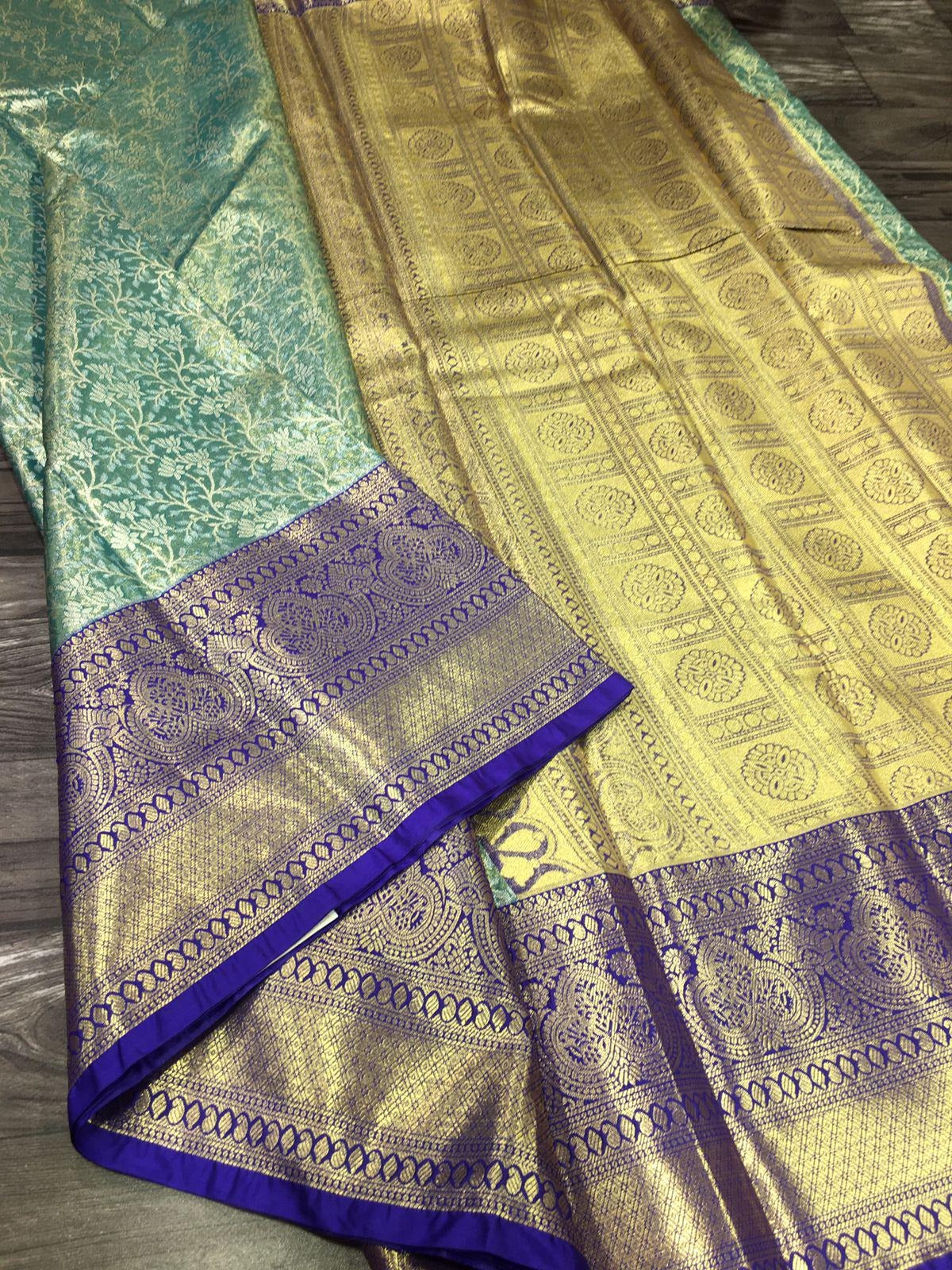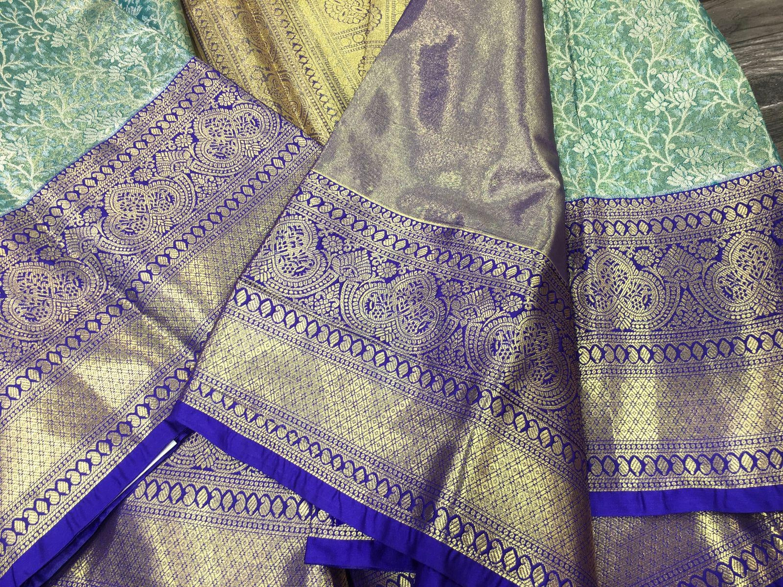 Elevate your ethnic wardrobe with this exquisite semi-Kanchipuram tissue saree, a stunning blend of tradition and elegance. Crafted with lightweight silk tissue fabric, this saree features a captivating dual-tone palette: a serene turquoise blue body adorned with delicate silver floral motifs, paired with a rich golden yellow pallu woven in intricate gold and purple threadwork.