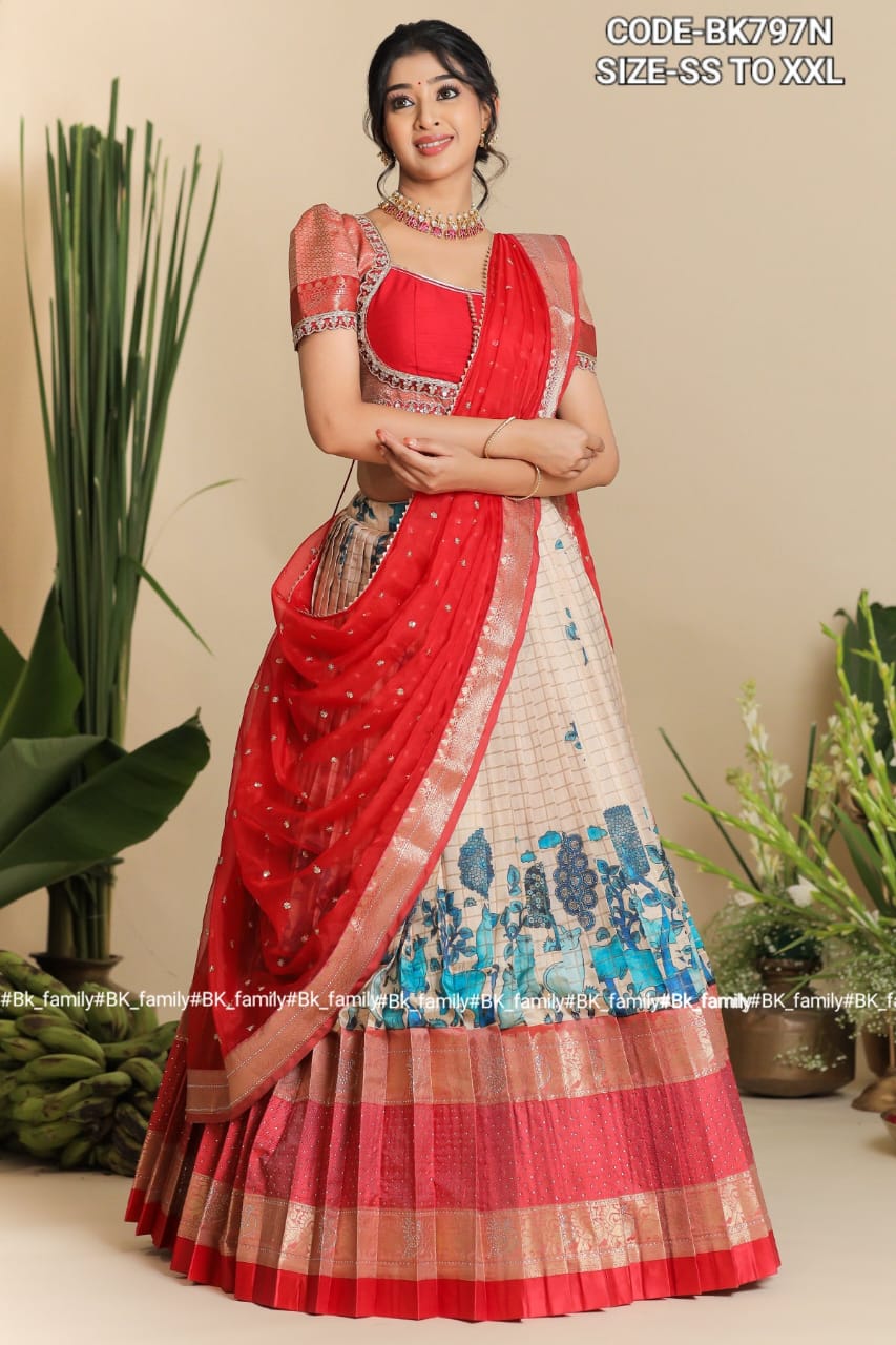 Experience the height of elegance this festive season with the striking Saloni Banarasi Lehenga / half saree set in a bright red color. This exquisite piece showcases fine potli work on the front and delicate lace details, complemented by a wide pattu border adorned with shimmering Swarovski crystals. To complete the ensemble, a 3-meter Organza dupatta adds the perfect touch with intricate butti work.