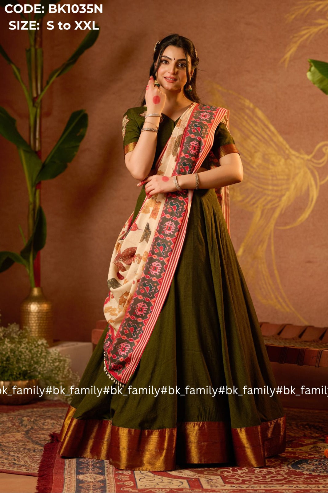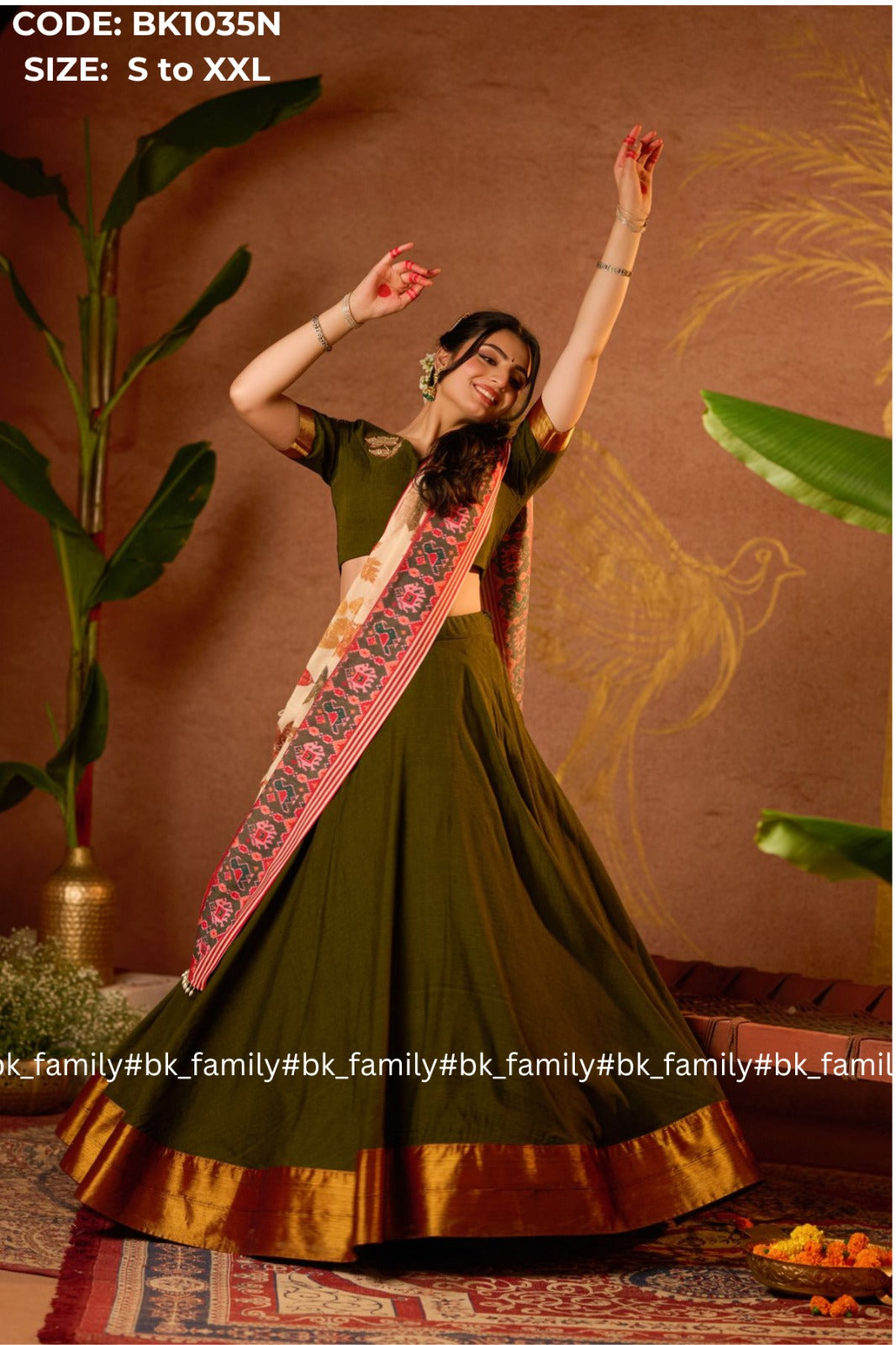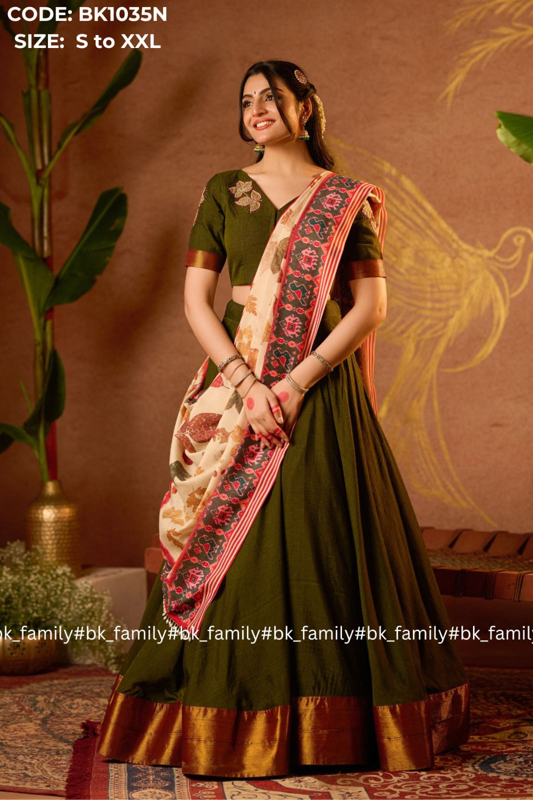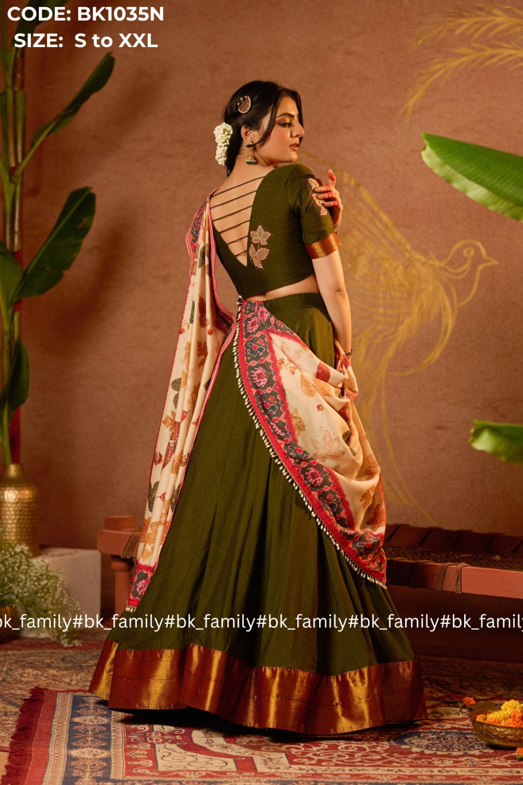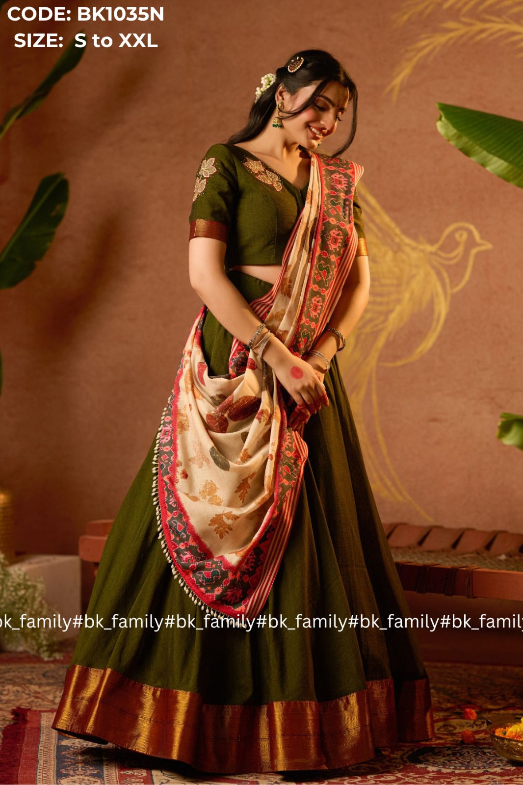 Tithi Lehenga Set in Mehendi Set is ready to wear, Banarasi silk lehenga / half saree